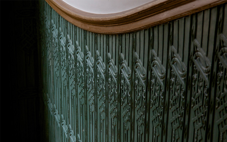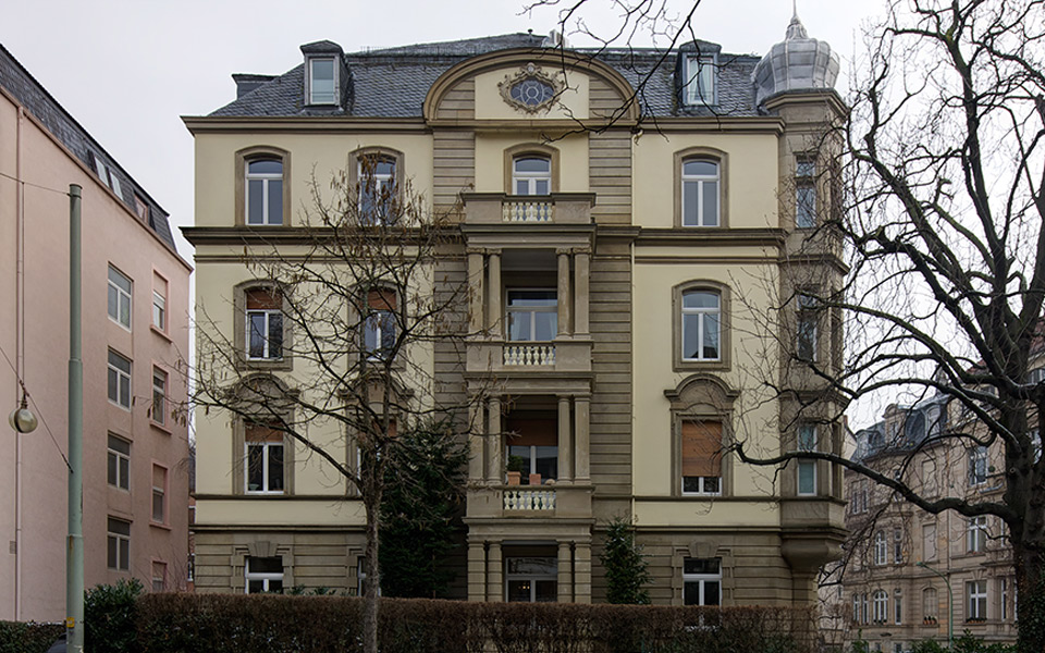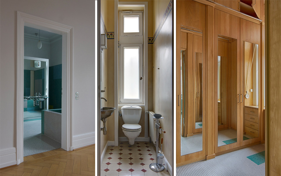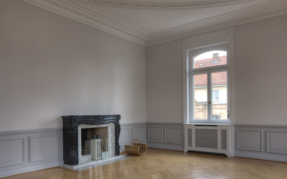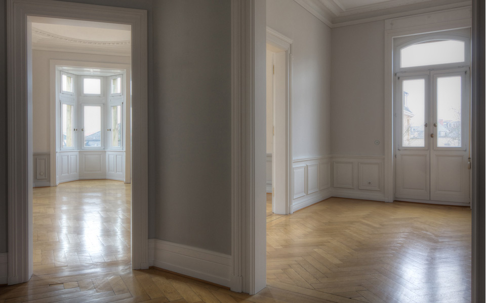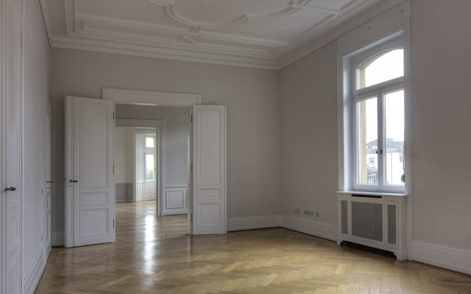 verbinden die Räume. Die Zimmerflucht beginnt im hellen Erkerraum mit offenem Kamin. Stuck